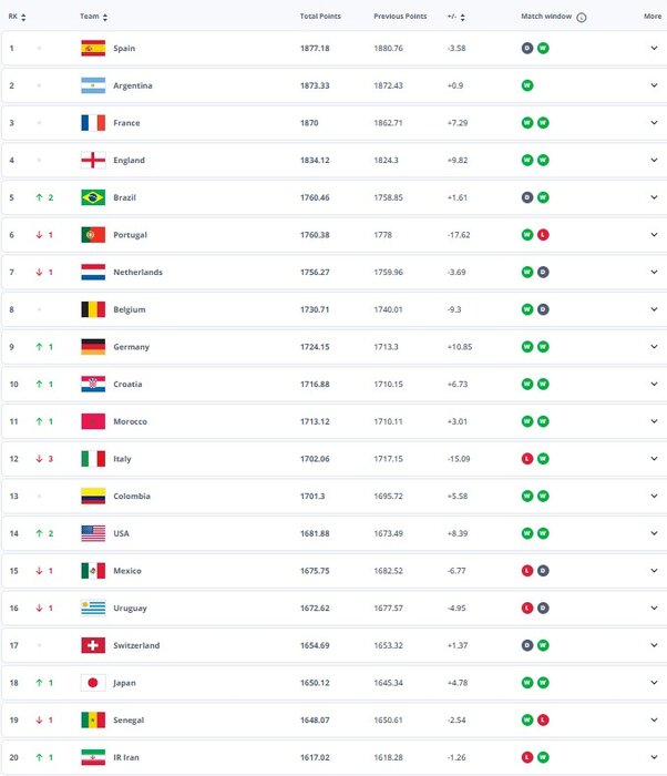 در این رنکینگ، اسپانیا در رتبه نخست است و آرژانتین در جایگاه دوم قرار دارد. فرانسه، انگلیس، برزیل، پرتغال، هلند، بلژیک ، آلمان و کرواسی نیز در رتبههای چهارم تا دهم هستند.